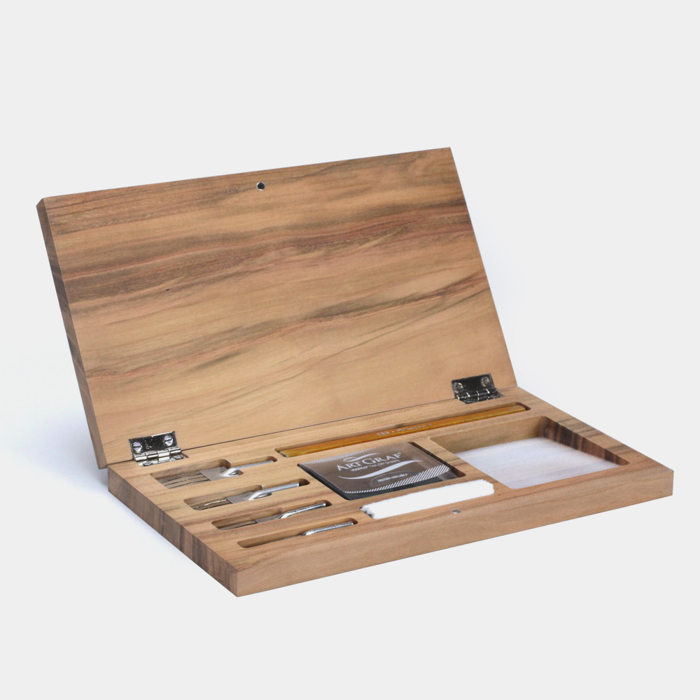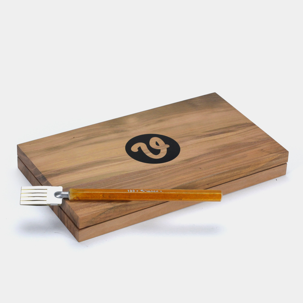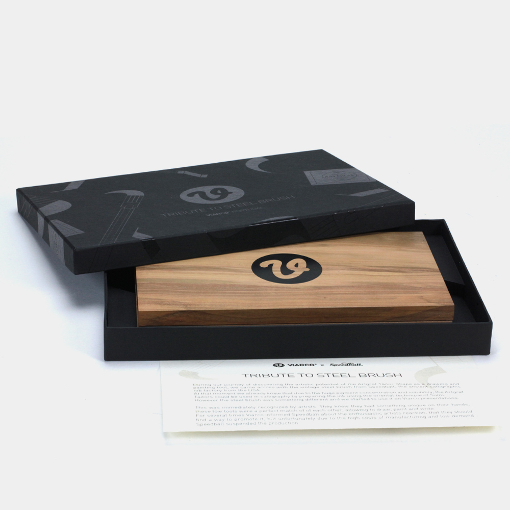 From a local cherry tree we have made the box, a simple design based on the pencil manufacturing process called “sandwich”. For the pen holder we used the few remain original Viarco double holder from the 1960’s to allow the creation of different strokes. For the ink, the box has an area to prepare it the same way the oriental artist do. We also included the black Tailor to draw and make the ink, and to connect everything the 4 sizes of the amazing steel brush.